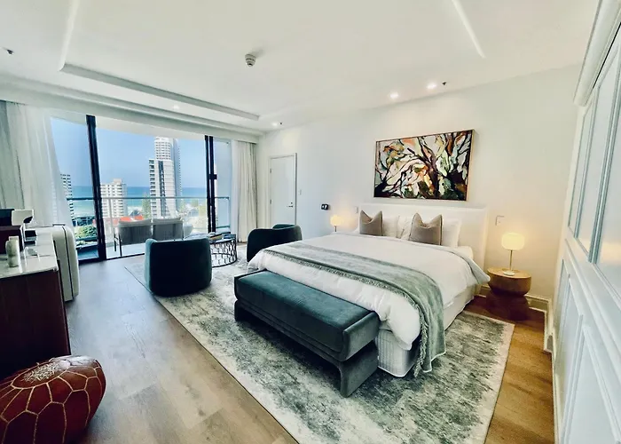 Boutique Ocean View Studio With King Bed & Spa ferielejlighed ligger i centrum af Gold Coast, inden for kort afstand til Cascade Gardens.